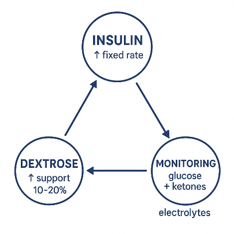 The arrows in the management triangle show balance among all three—raising dextrose enables higher insulin, which accelerates acidosis resolution, all under tight monitoring.