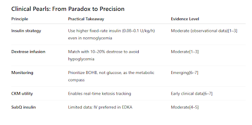 Traditional DKA protocols titrate insulin to glucose, reducing rates as glucose falls below 250 mg/dL. In EDKA, however, this strategy backfires. Glucose looks “fine,” but acidosis lingers because insulin doses are reduced too early.