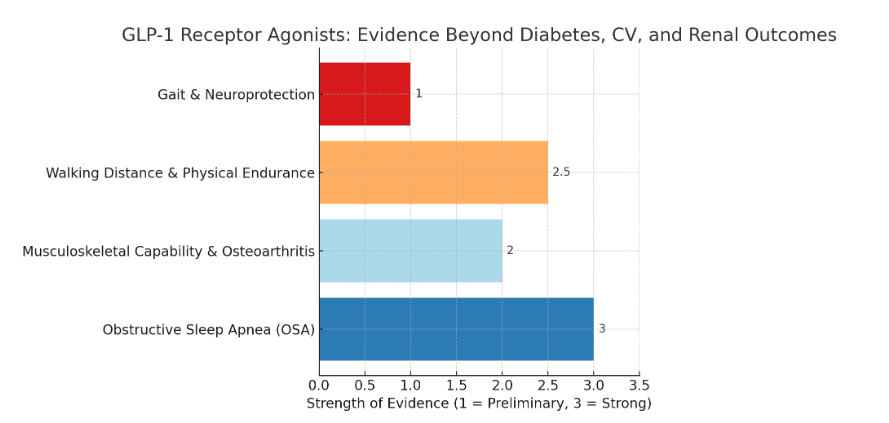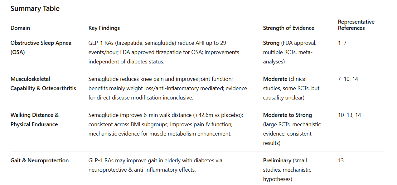 GLP-1 RAs improve OSA severity, musculoskeletal pain and function (especially in osteoarthritis), and walking distance/endurance, with the strongest evidence for OSA and weight-related musculoskeletal improvement. These effects are most pronounced in patients with obesity and are increasingly recognized in clinical guidelines and regulatory approvals.